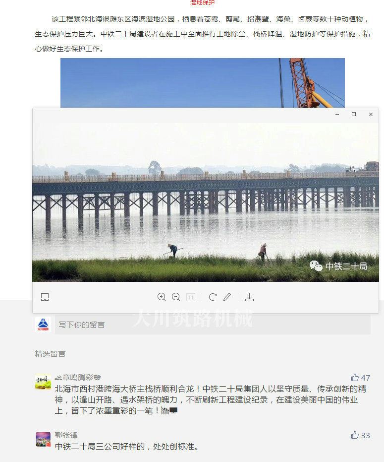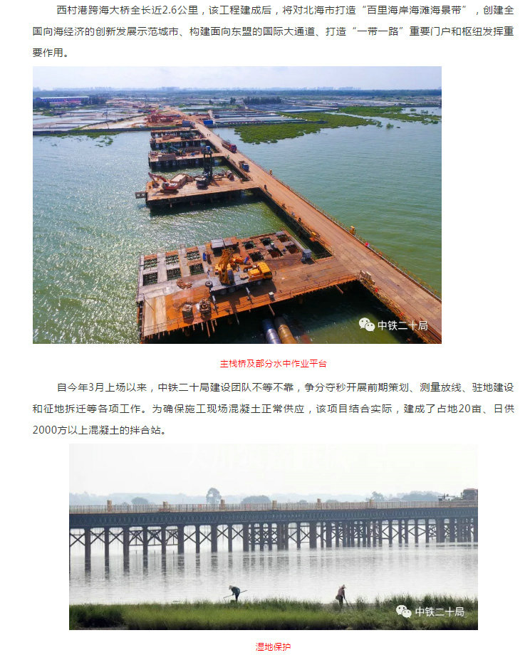 該工程緊鄰北海銀灘東區海濱濕地公園,棲息著蒼鷺、剪尾、招潮蟹、海桑、鹵蕨等數十種動植物,生態保護壓力巨大。中鐵二十局建設者在施工中全面推行工地除塵、棧橋降溫、濕地防護等保護措施,精心做好生態保護工作。